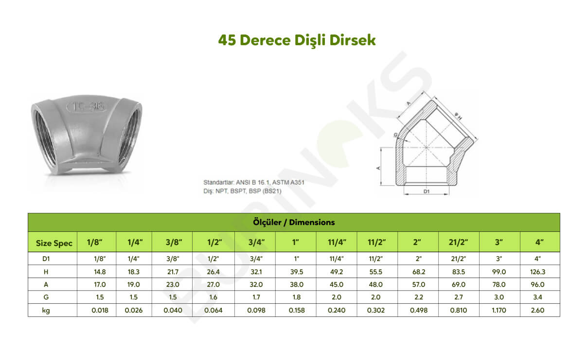 Ayrıca, hijyenik özellikleri sayesinde gıda ve sağlık sektörlerinde de güvenle kullanılır. Paslanmaz 45 derece dişli dirsekler, farklı çap ve diş boyutlarında temin edilebilir, bu da projelere özel çözümler sunarak montaj ve entegrasyonu kolaylaştırır. Dayanıklı yapıları ile endüstriyel sistemlerde vazgeçilmez bir bileşen olarak öne çıkar.